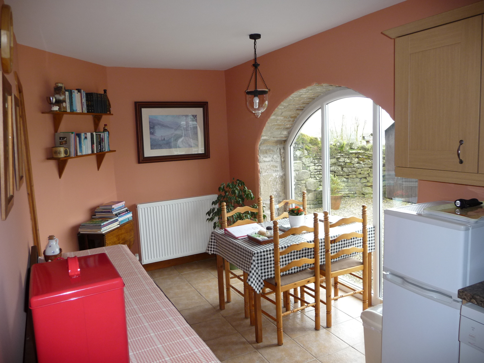 Kitchen/Diner: A dining table seating four overlooking the large feature-arched window with views of the reservoir.